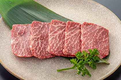 モモ系。モモ系で一番サシが入り、甘みがある希少部位。あぶり寿司などに使われる希少部位。レア焼がおすすめ。